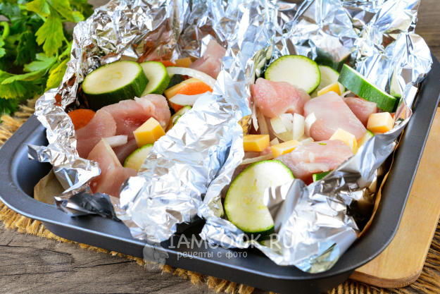 Теперь фольгу смажьте растительным маслом и выложите туда все продукты. Я разделила фольгу на несколько частей, чтобы блюдо получилось порционным.