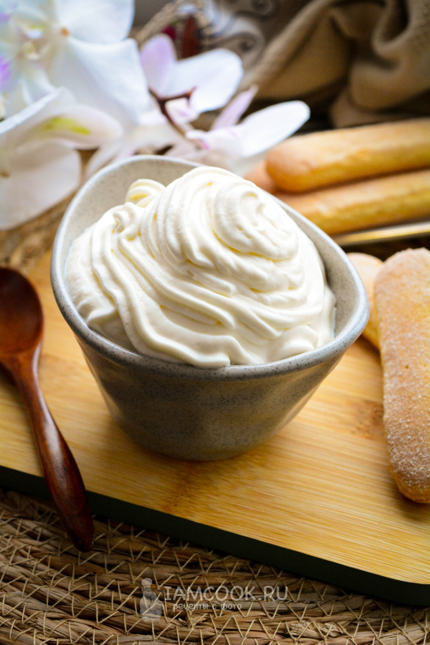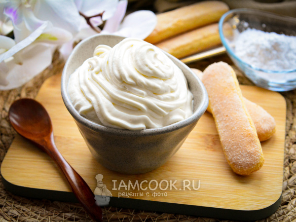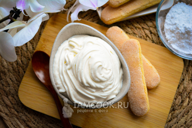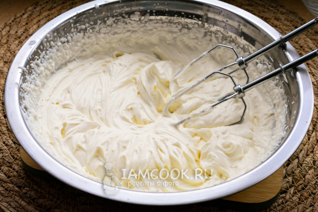 Взбивайте все ингредиенты при помощи миксера. Сперва включите минимальную скорость, затем постепенно увеличивайте. Взбивайте крем для тирамису без яиц 3-4 минуты, он получается плотным, с мягкими пиками. Готово!