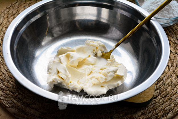 Сыр Маскарпоне выложите в глубокую миску, разомните ложкой или венчиком.