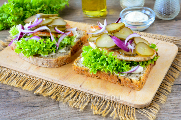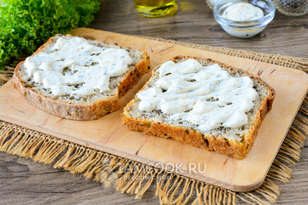Ломтики тостового хлеба слегка подсушите на сухой сковороде, смажьте готовым соусом Тартар.
