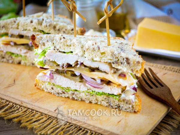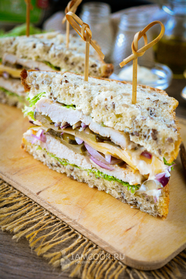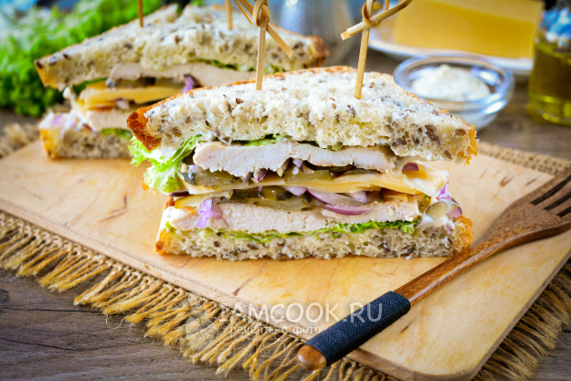 Соедините ломтики хлеба начинкой внутрь, затем разрежьте сэндвич с курицей и сыром по диагонали, закрепив шпажками. Закуска готова!