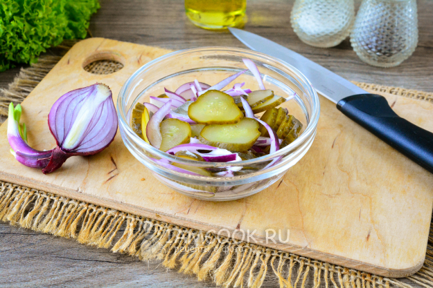 Перемешайте соленые огурцы с красным луком, оставьте на 10 минут, чтобы лук промариновался в огуречном соке, так будет вкуснее.