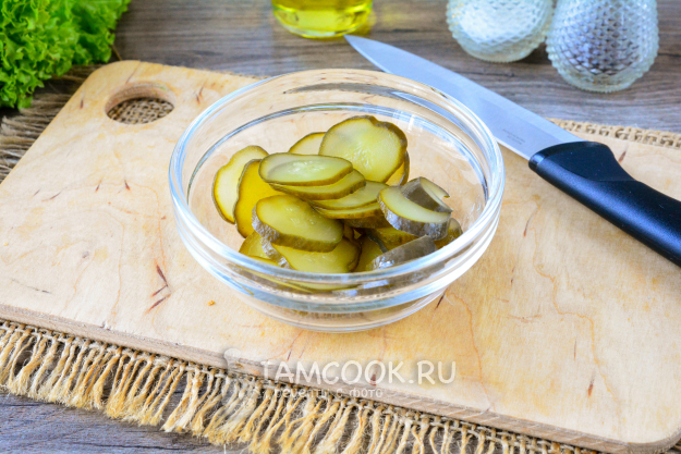 Соленые огурцы нарежьте тонкими слайсами-колечками.