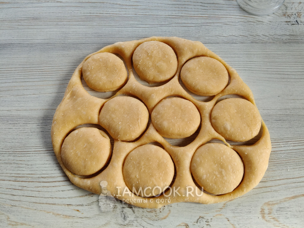 Его надо немного раскатать, нарезать любым стаканчиком.