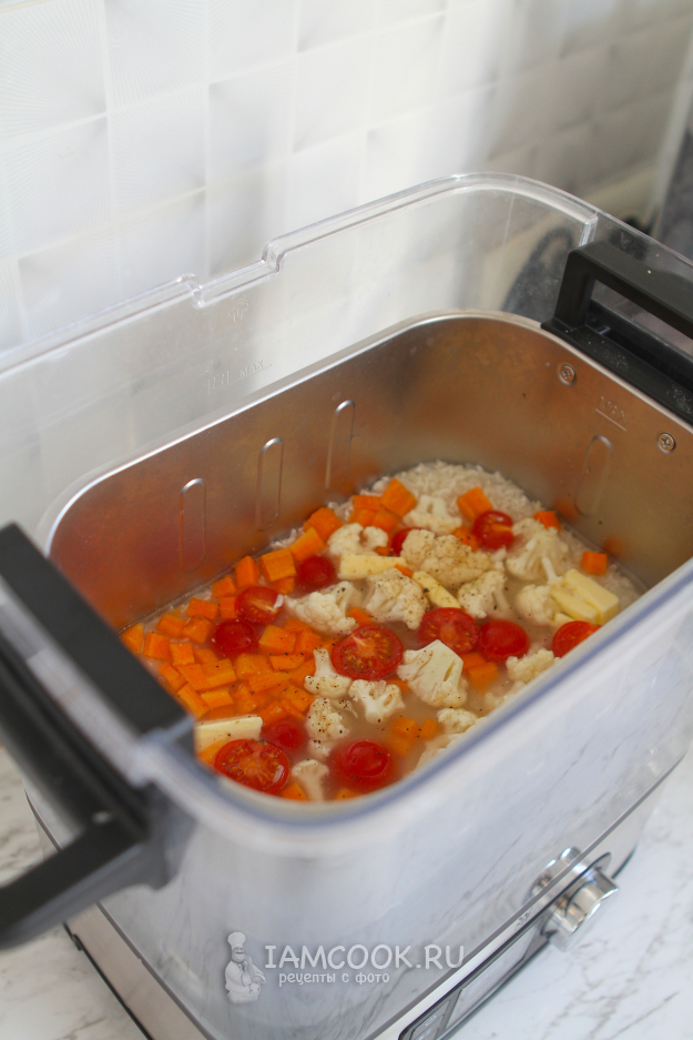 Я готовила в пароварке WMF Lono. В комплекте к этой пароварке шла специальная вставка Slow Cook. Вставка позволяет готовить пищу в течение длительного времени, при температуре ниже точки кипения. Выложила в нее рис с овощами.