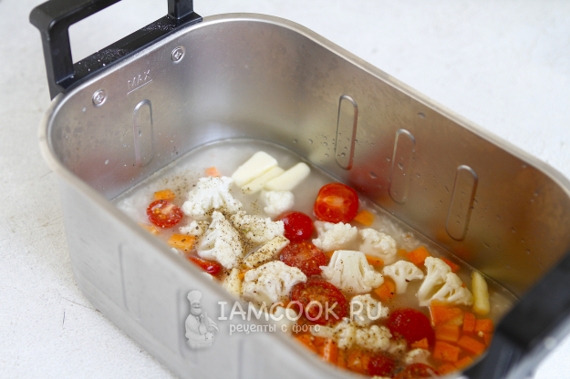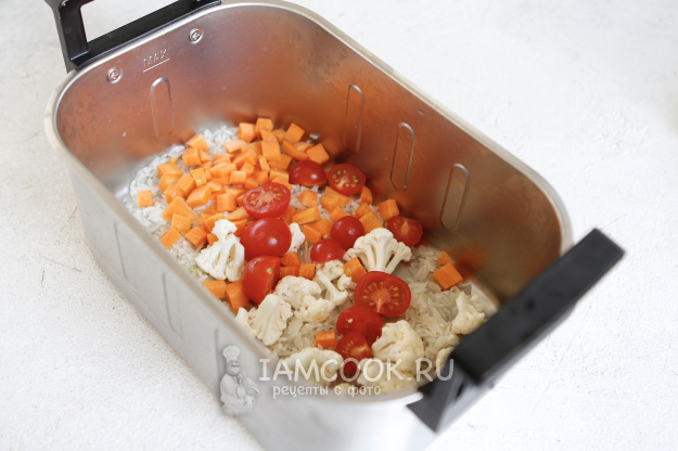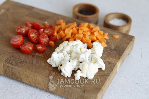У меня в холодильнике было всего по чуть-чуть. Цветную капусту разделала на небольшие соцветия, морковь почистила и нарезала кубиком. Помидоры черри разрезала пополам. Чем мельче будут нарезаны овощи, тем быстрее они приготовятся.