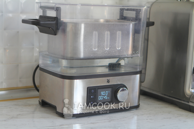 Выставила температуру 90 градусов, это максимальная температура, которую поддерживает пароварка, время - 45 минут. Если ваша пароварка поддерживает температуру 100 градусов, то время приготовления нужно будет немного уменьшить (ориентируйтесь на 30 минут).