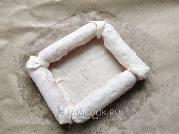 Лепешку достать из морозилки, снять пленки и переложить на противень с пергаментом.