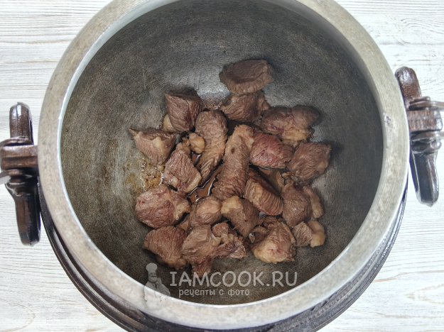 В казан налить масло, нагреть, выложить мясо. Быстро поджарить.