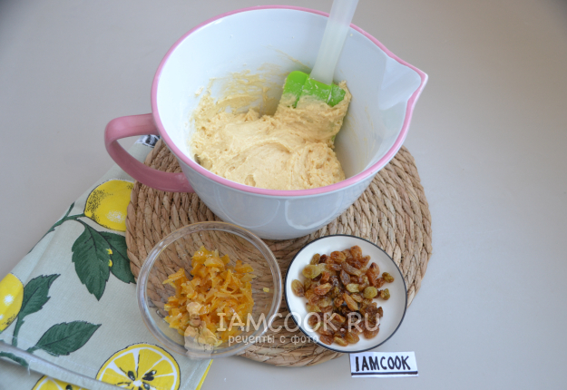 Смешайте ингредиенты силиконовой лопаткой (не миксером). Добавьте в тесто мелко нарезанные лимонные цукаты и промытый изюм, смешайте.