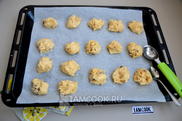 Разогрейте духовку до 180 градусов в режиме "верх-низ". Застелите противень пергаментом. Тесто очень липкое, поэтому выкладывайте печенье на противень с помощью двух ложек, удобно использовать ложку для мороженого. Печенье выкладывайте на расстоянии, так как при выпечке оно увеличивается в размерах. Выпекайте до готовности, примерно 15-20 минут, в зависимости от вашей духовки.