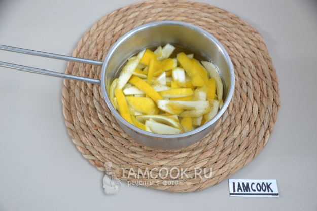 Сложите лимонные корочки в сотейник или ковш, залейте водой, доведите до кипения, варите 1-2 минуты, слейте воду, промойте холодной водой. Повторите эту процедуру три раза.