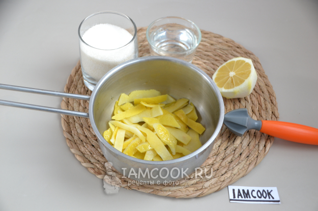 Засыпьте лимонные корочки 200 г сахара, влейте 100 мл воды, добавьте сок половины лимона, поставьте на небольшой огонь, варите в сиропе 30 минут.
