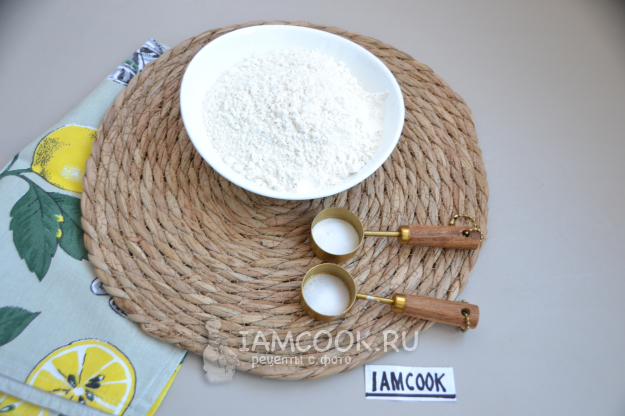 Смешайте муку, соль и соду. Если вы чувствительны к соде, ее можно заменить на 1 ч.л. (без горки) разрыхлителя.