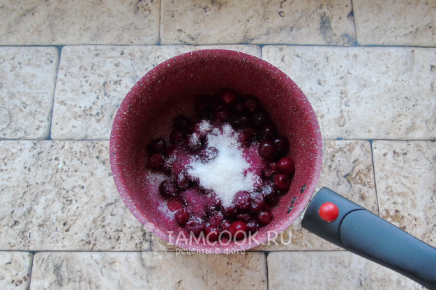 Насыпьте сахар. Прогревайте вишню с сахаром, пока она не пустит сок и сахар не растворится.