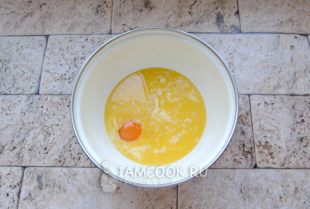 Налейте теплое молоко. Сливочное масло растопите, немного охладите и добавьте тоже. Разбейте яйцо. Насыпьте соль, сахар и ванильный сахар.