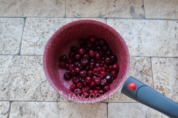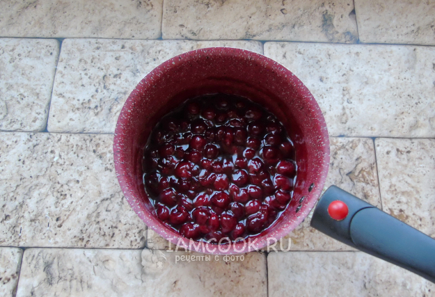 А пока тесто подходит, займитесь начинкой. Вишню помойте и выложите в кастрюлю с толстым дном или антипригарным покрытием. Мороженую размораживать не нужно.