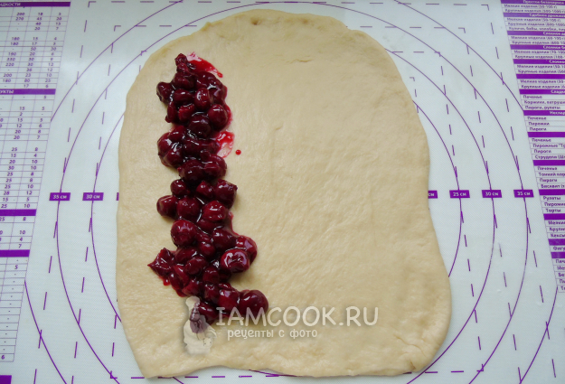 Когда тесто подойдет, достаньте его из миски и обомните. Разделите на две части. Одну раскатайте в пласт, и выложите на край вишневую начинку.