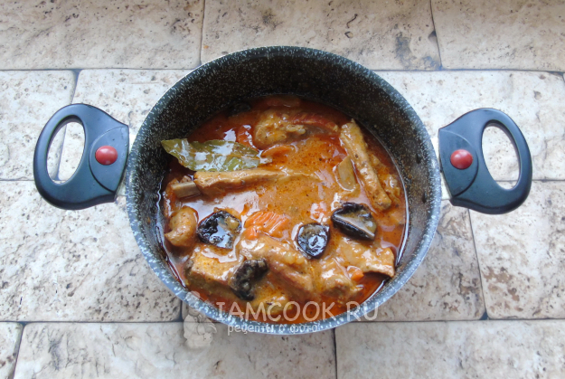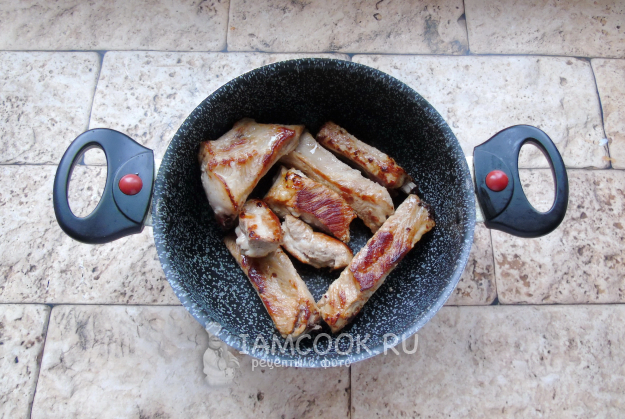 Тушите свиные ребрышки до готовности. Мясо должно хорошо отходить от кости.