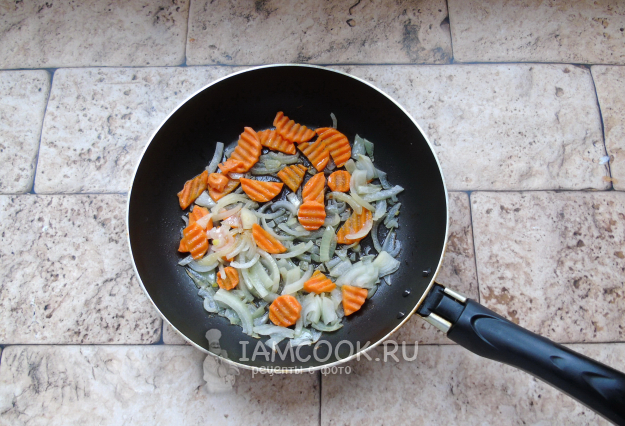Тем временем лук и морковь очистите, помойте и нарежьте произвольно. Обжаривайте на сковороду в масле 5-6 минут.