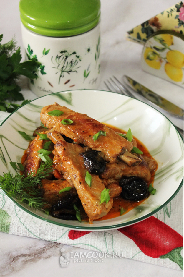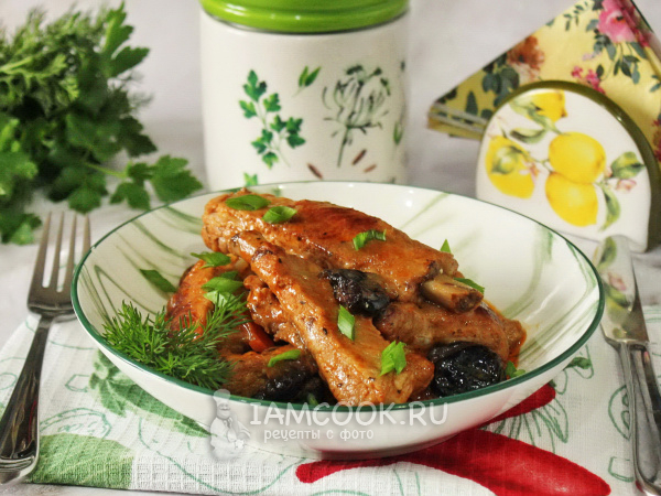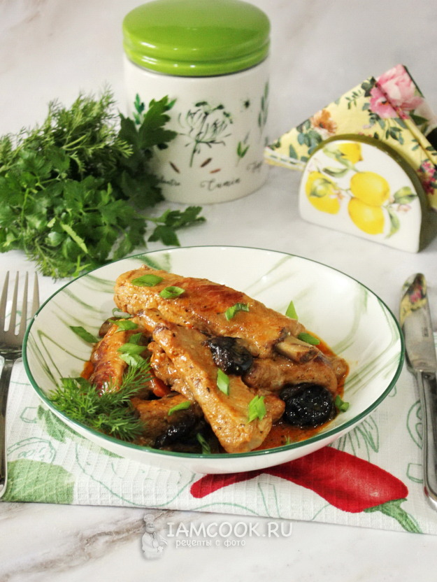 Соберите ингредиенты для приготовления свиных ребрышек с черносливом.