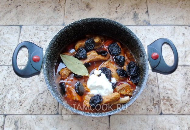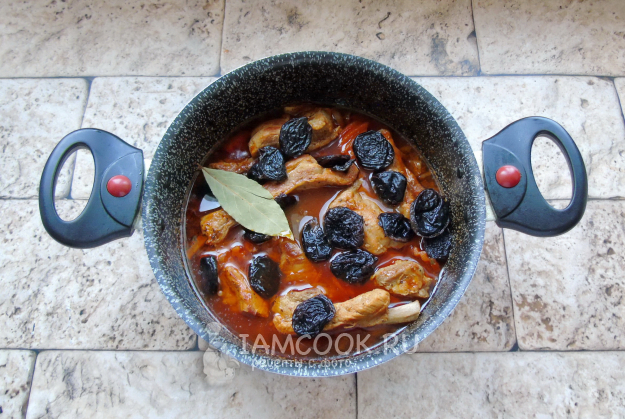 Тушите ребрышки почти до готовности. Чернослив тщательно помойте горячей водой и выложите в кастрюлю. Добавьте лавровый лист. Посолите, поперчите и насыпьте любую сухую приправу по вкусу. У меня базилик.