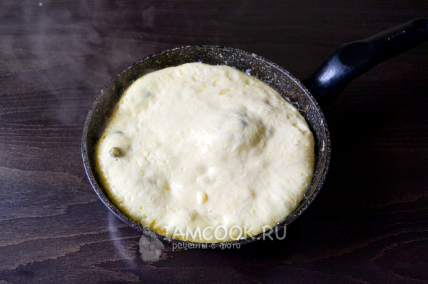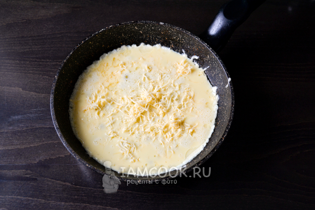 Разогрейте сковороду с растительным маслом и налейте омлетную смесь. Посыпьте натертым сыром.