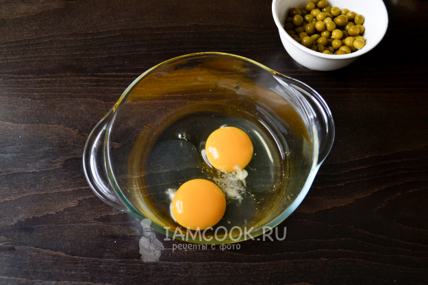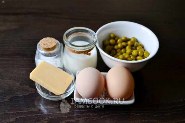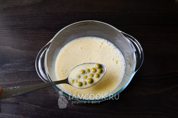 Всыпьте в молочно-яичную смесь горошек.