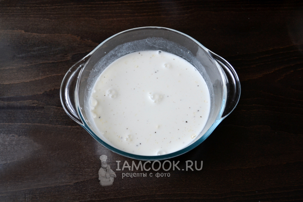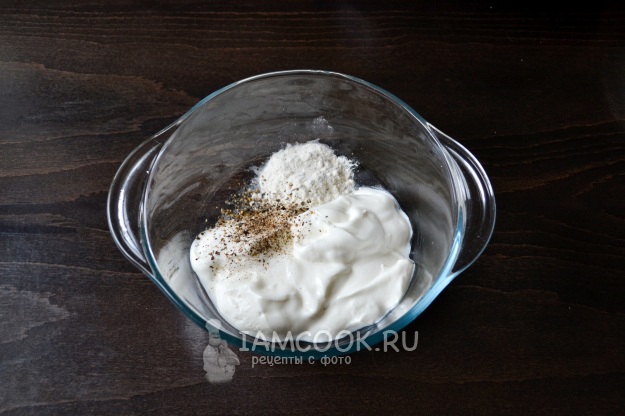 Для соуса положите в миску сметану, пшеничную муку, соль, перец черный молотый. По желанию добавьте любимые специи и приправы.