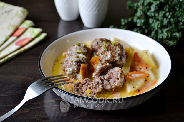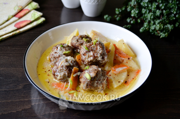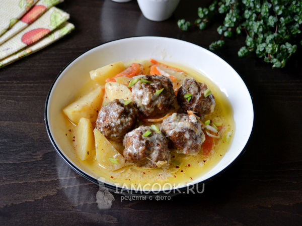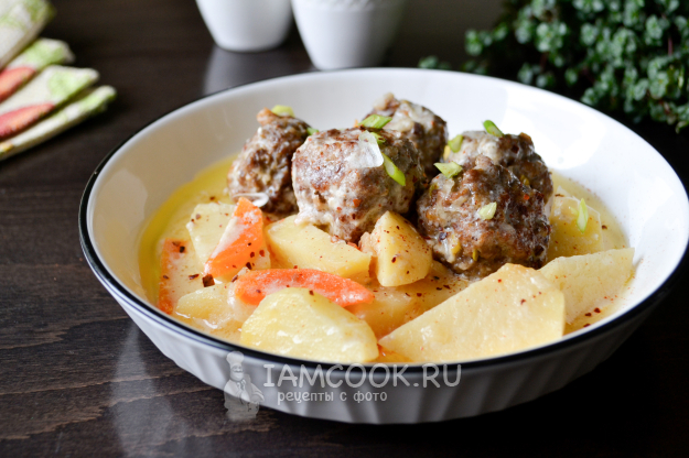Подавайте картошку с фрикадельками в сметанном соусе сразу, горячей.