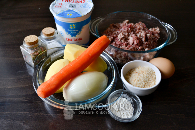 Соберите продукты для приготовления картошки с фрикадельками в сметанном соусе. Картошку, морковь и лук почистите, вымойте. Фарш возьмите по вкусу. Можно взять смесь из двух видов фарша.