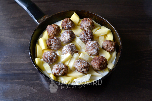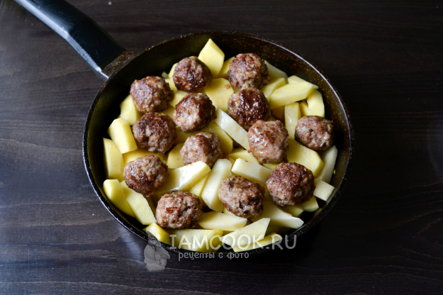 Положите в сковороду нарезанный не мелкими ломтиками картофель, сверху положите фрикадельки. Посолите картофель.