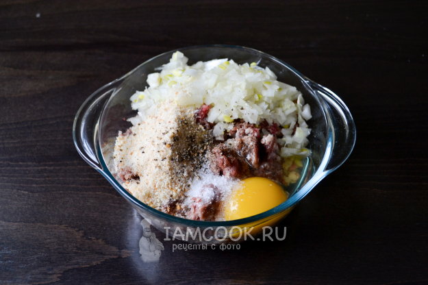 В миску положите мясной фарш, разбейте яйцо, добавьте мелко нарезанный репчатый лук, панировочные сухари, соль, перец черный молотый.