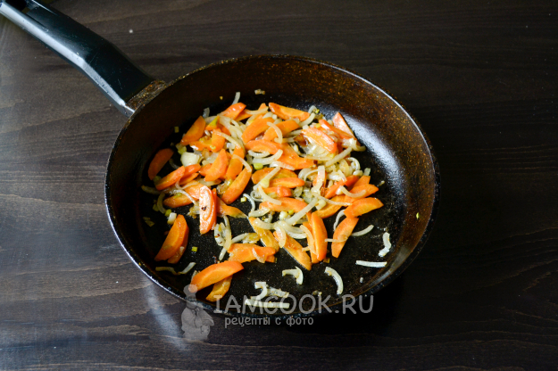 Положите в сковороду нарезанный лук и морковь.