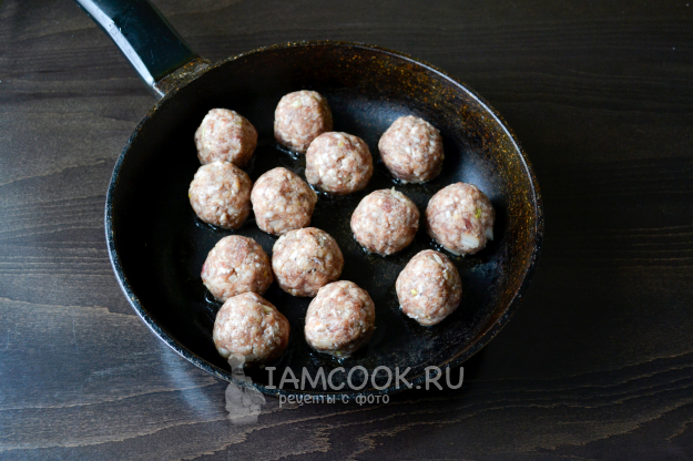На сильном огне обжарьте фрикадельки до легкой румяной корочки. Во время жарки обязательно переворачивайте фрикадельки, чтобы обжарились равномерно. Слегка обжаренные фрикадельки снимите со сковороды.