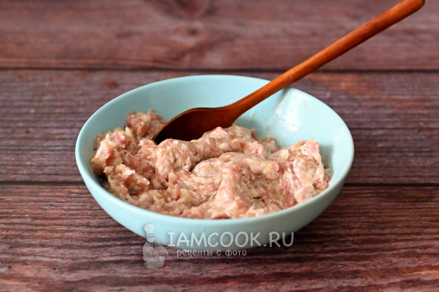 Тщательно перемешайте фарш с луком и солью.