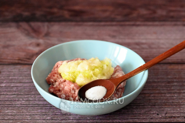 В миску положите мясной фарш, добавьте к нему измельчённый на тёрке лук и немного посолите. Можно поперчить по желанию.