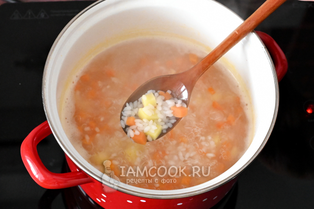 Доведите вновь всё до кипения и варите на среднем огне примерно 12-15 минут, до полуготовности риса и картофеля.