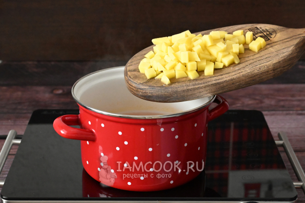 Затем отправьте в кастрюлю нарезанный кубиками картофель.