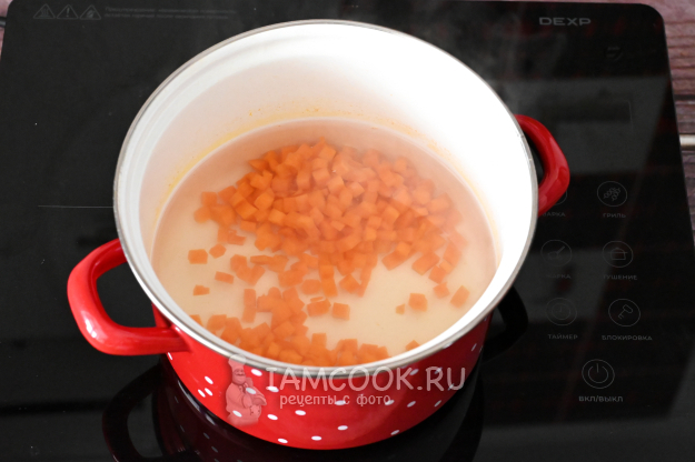 В кастрюлю налейте около литра воды и забросьте в воду морковь, нарезанную кубиками.