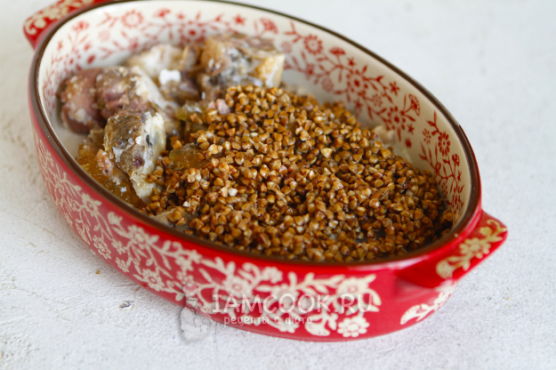 Гречку хорошо промойте, откиньте на дуршлаг и переложите в форму.