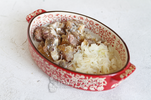 Подготовьте форму для запекания, которую вы спокойно можете установить в чашу аэрогриля. В форму переложите тушенку и жареный лук. Если нет подходящей формы, то готовьте прям в чаше аэрогриля.
