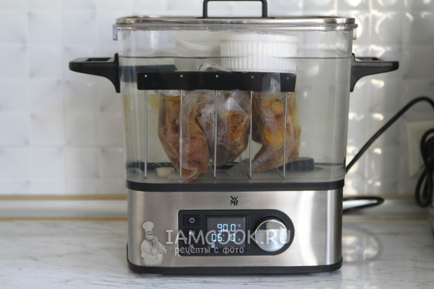 Пакет запечатываю при помощи вакуумного упаковщика, откачав лишний воздух. Нагреваю воду до 90 градусов и готовлю минимум 12, максимум 24 часа.