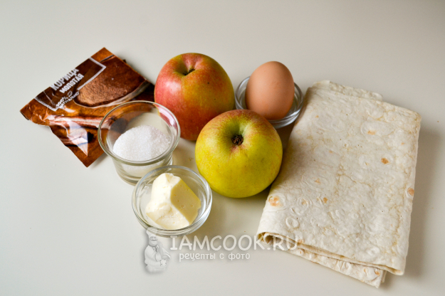 Продукты для приготовления треугольников из лаваша с яблоком в аэрогриле соберите по списку. Лаваш возьмите свежий - он будет легко сворачиваться, не рваться. Яблоки вымойте и очистите от кожуры.