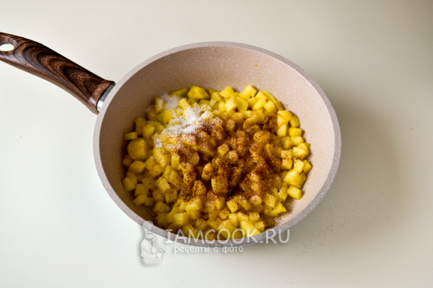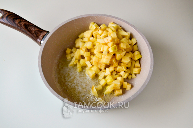 Растопите в сковороде сливочное масло и положите яблоки, нарезанные мелким кубиком.