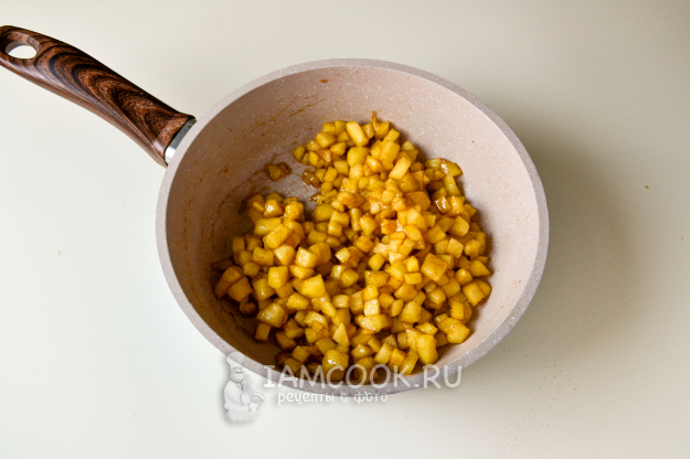 Помешивая, продолжайте жарить яблоки, чтобы сахар расплавился и яблочные кубики слегка карамелизовались.