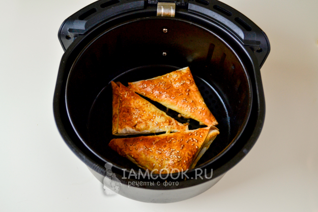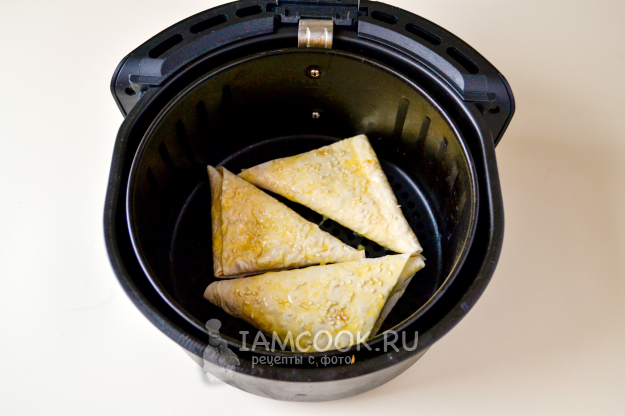 Положите треугольники в чашу аэрогриля. Яйцо разбейте в мисочку, взболтайте. Смажьте треугольники взболтанным яйцом, посыпьте кунжутом.