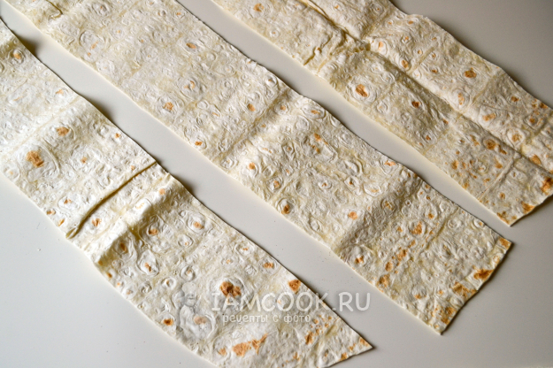 Лист тонкого лаваша разрежьте на полоски шириной примерно 8-10 см.