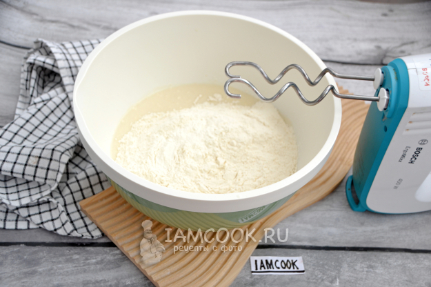Всыпьте муку, с помощью миксера или руками замесите тесто.