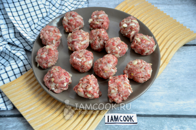 Сразу разделите мясной фарш на 15 частей, накройте пищевой пленкой от заветривания и подсыхания.